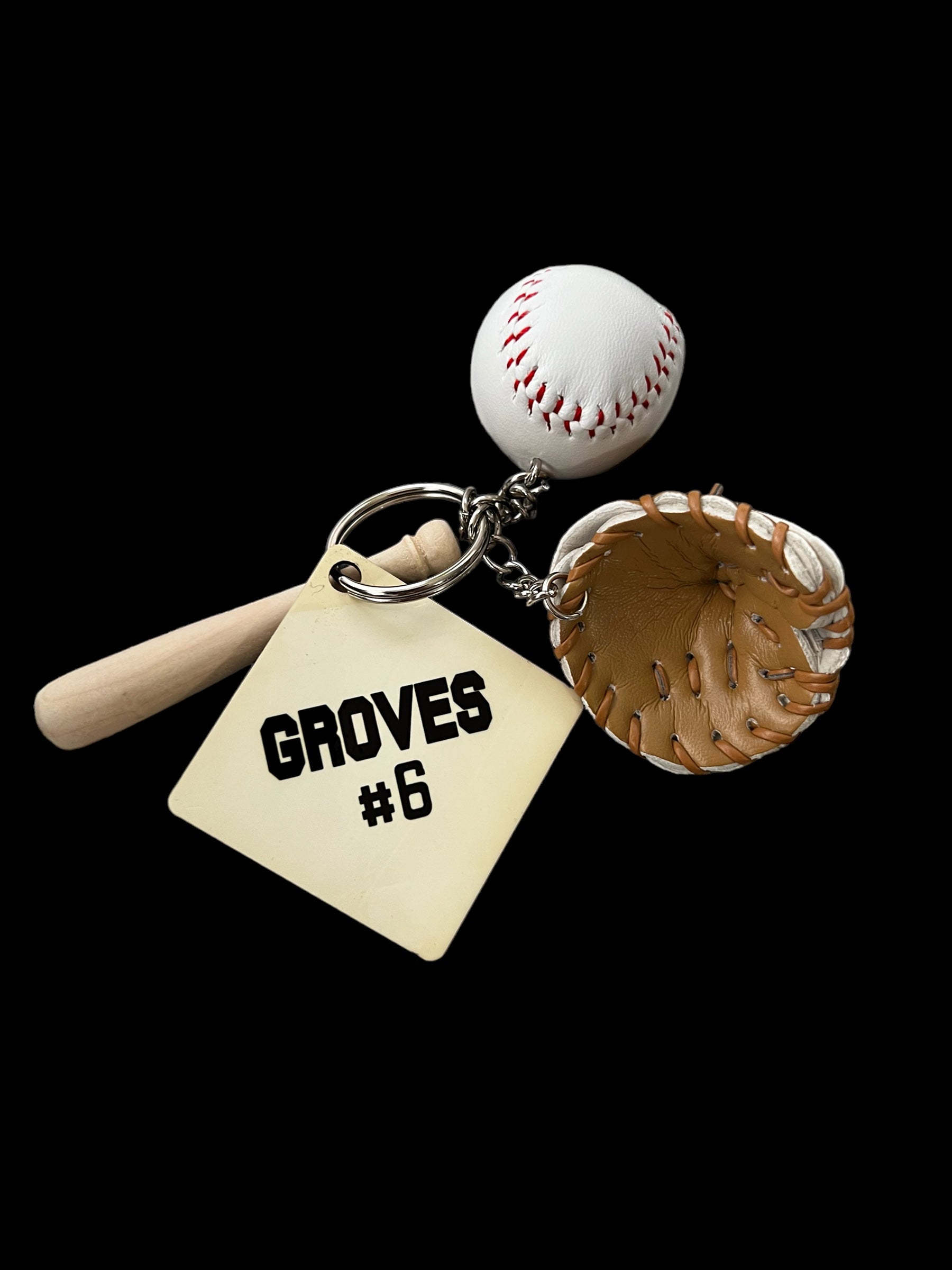 Cute keychain or bag tag for the player in your life. Personalized with your childs name and number on one side and the team logo on the other. Has miniature ball, bat and glove (glove is available in assorted colors, red, brown, black, orange and white)