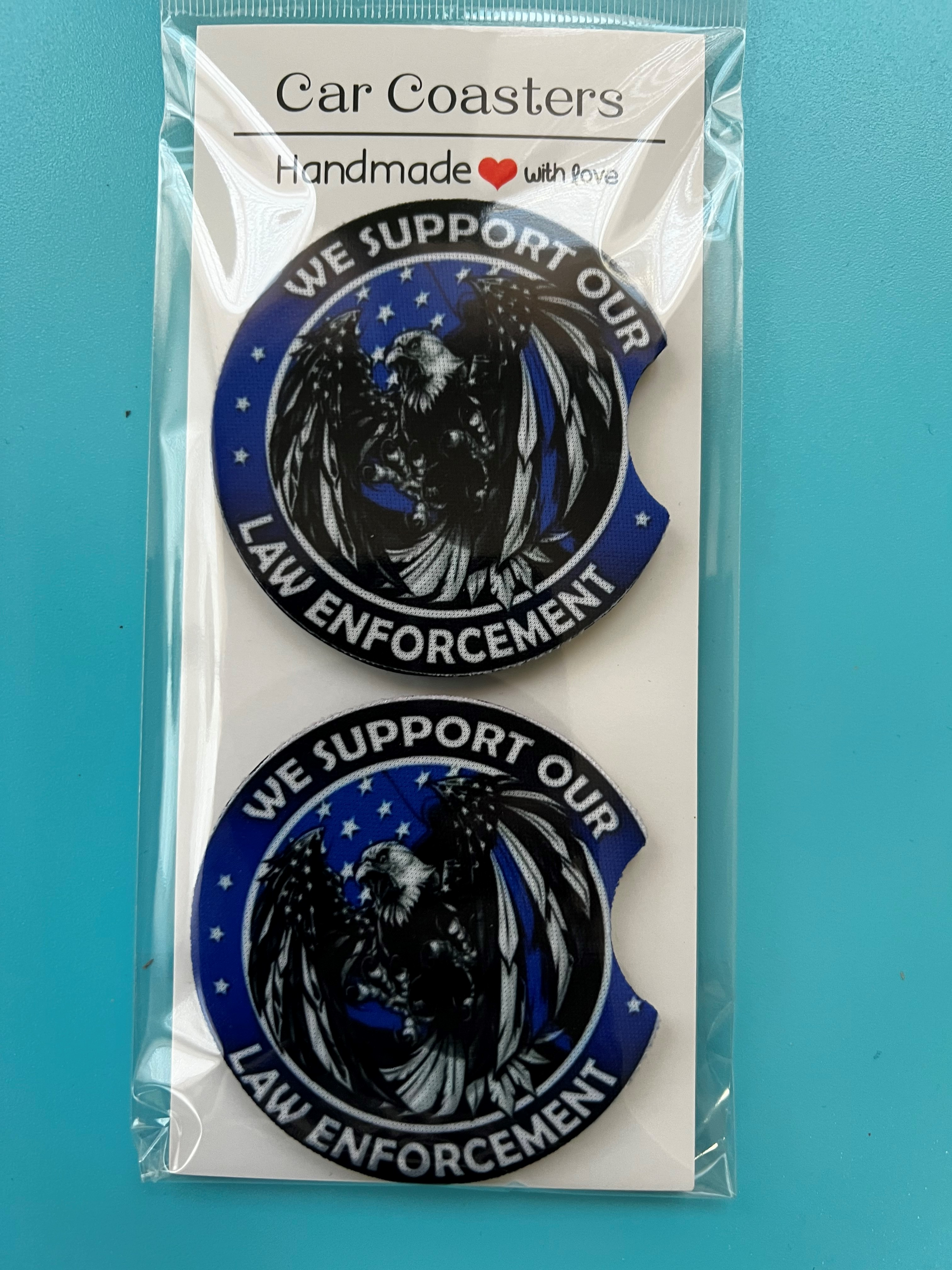 Neuroprene car coasters. Perfect for stocking stuffers. Absorbs moisture and fits most cup holders including car seats.